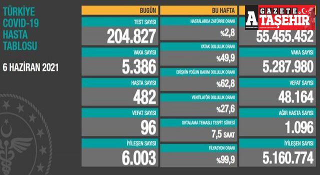 Buna göre, Türkiye'de son 24 saatte 204 bin 827 Kovid-19 testi yapıldı, 5 bin 386 kişinin testi pozitif çıktı, 96 kişi yaşamını yitirdi, hasta sayısı 482 olarak kayıtlarda yer aldı.