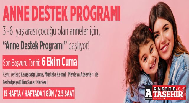 15 hafta boyunca, haftada bir gün ve 2,5 saat süreyle uygulanacak Anne Destek Programı’na katılmak isteyenler Kayışdağı Lions, Mustafa Kemal, Mevlana Ataevleri ile Ferhatpaşa Bilim Sanat Merkezi’ne başvuru yaparak daha ayrıntılı bilgi edinebilirler.