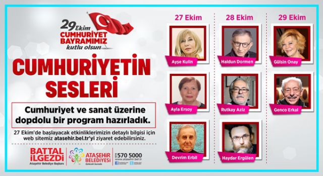 27-29 Ekim tarihleri arasında gerçekleştirilecek “Cumhuriyet’in Sesleri” etkinlik programıyla Genco Erkal, Haldun Dormen, Rutkay Aziz, Haydar Ergülen, Ayşe Kulin, Prof. Devrim Erbil ve Prof. Dr. Ayla Ersöy izleyici karşısına çıkacak. Cumhuriyetin yetiştirdiği değerli sanatçılar, Türkiye’nin sanat tarihi yolculuğunda deneyimlerini paylaşacaklar.