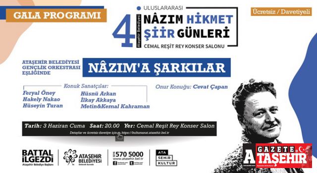 Ataşehir Belediyesi, Memleket ve Dünya Şairi Nâzım Hikmet’e saygı ve özlem duruşu taşıyan Uluslararası Nâzım Hikmet Şiir Günleri’ni bu yıl 4. kez düzenleyecek. Büyük ustanın ölüm yıl dönümü olan 3 Haziran’da başlayacak Şiir Günleri’ne Türkiye’den ve yurt dışından birçok şair katılacak. Şiir Günleri’nin bu yılki onur konuğu ise, akademisyen, şair ve yazar Cevat Çapan. Cemal Reşit Rey Konser Salonu, Adalar Vapuru ve Ataşehir Amfili Park’ta üç gün boyunca şiirler okunacak, şarkılar söylenecek ve şaire duyulan sevgi her yerden yankılanacak. İstanbul’un simgelerinden Şehir Hatları vapuru da Şiir Günleri’nde bir günlüğüne “Şiiriçi Hatları Vapuru”na dönüşecek.