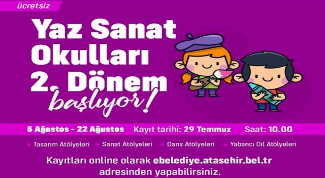Ataşehir Belediyesi’nin, yaz tatilindeki öğrenciler için hazırladığı “Yaz Sanat Okulu”nun 2. dönemi başlıyor. Kayıtlar, 29 Temmuz’dan itibaren online olarak ve eğitimlerin verileceği merkezlerden alınmaya başlanacak.