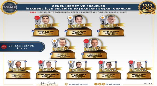 İstanbul ilçe belediye başkanlarının genel hizmet ve projelerinin başarı sıralamasında ilk sırayı yüzde 67,2 ile Kartal Belediye Başkanı Gökhan Yüksel aldı. Esenler Belediye Başkanı Tevfik Göksu'nun yüzde 66,4 ile 2. sırada yer aldığı sonuçlarda, 3. sıranın sahibi ise yüzde 65,1 ile Üsküdar Belediye Başkanı Hilmi Türkmen oldu.