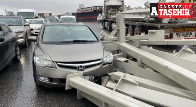 Ataşehir'de tırda yüklü olan çelik konstrüksiyonlar, tırın manevra yaptığı sırada iplerin kopması nedeniyle 2 otomobilin üzerine düştü. Yaşanan kaza sonrası otomobillerde maddi hasar oluştu.