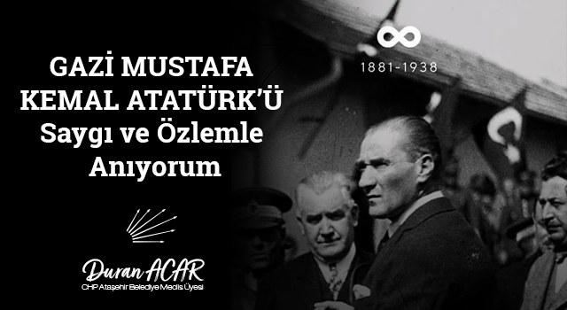 CHP'li Ataşehir Belediye Meclis Üyesi Duran Acar, Türkiye Cumhuriyeti'nin kurucusu Mustafa Kemal Atatürk'ün ölümünün 84'üncü yıl dönümü nedeniyle mesaj yayımladı.