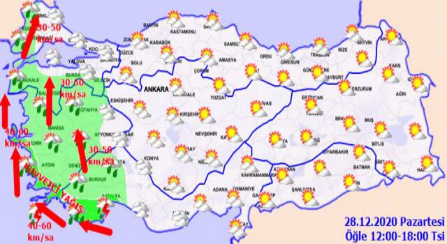 Meteoroloji'nin 28 Aralık hava durumu raporu yayımlandı. Meteoroloji Genel Müdürlüğü tarafından yapılan son değerlendirmelere göre, ülkemizin batı kesimlerinin parçalı ve çok bulutlu, Marmara'nın batısı, Ege, Batı Akdeniz ve İç Anadolu'nun kuzeybatısı ile İstanbul, Yalova, Bursa, Bilecik ve Bolu çevrelerinin yağmur ve sağanak yağışlı, Güney Ege kıyıları ile Antalya çevrelerinin yer yer gök gürültülü sağanak yağışlı, diğer yerlerin parçalı ve az bulutlu geçeceği tahmin ediliyor.