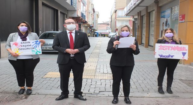 Pandemi nedeniyle Prestij Caddesi’nde sınırlı sayıda katılımla yapılan basın açıklamasına İlçe başkanı Celal Yalçın, Kadın Kolları Başkanı Seval Düzenli ve yönetimi katıldı.