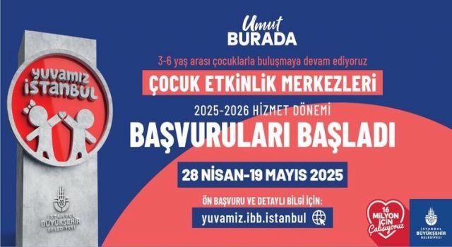 Yuvamız İstanbul Çocuk Etkinlik Merkezleri’nde 2025- 2026 hizmet dönemi için başvurular 28 Nisan – 19 Mayıs tarihleri arasından yuvamiz.ibb.istanbul internet sitesi üzerinden yapılabilecek.